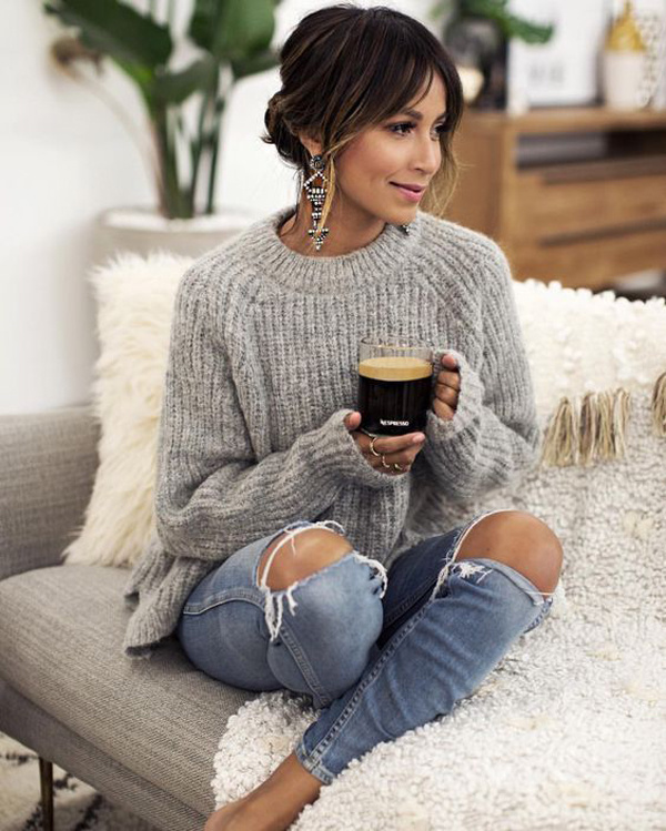 Diện một chiếc áo len mỏng, búi tóc thấp đánh rối nhẹ và thưởng thức một tách trà nóng để tận hưởng gió lạnh đầu mùa.