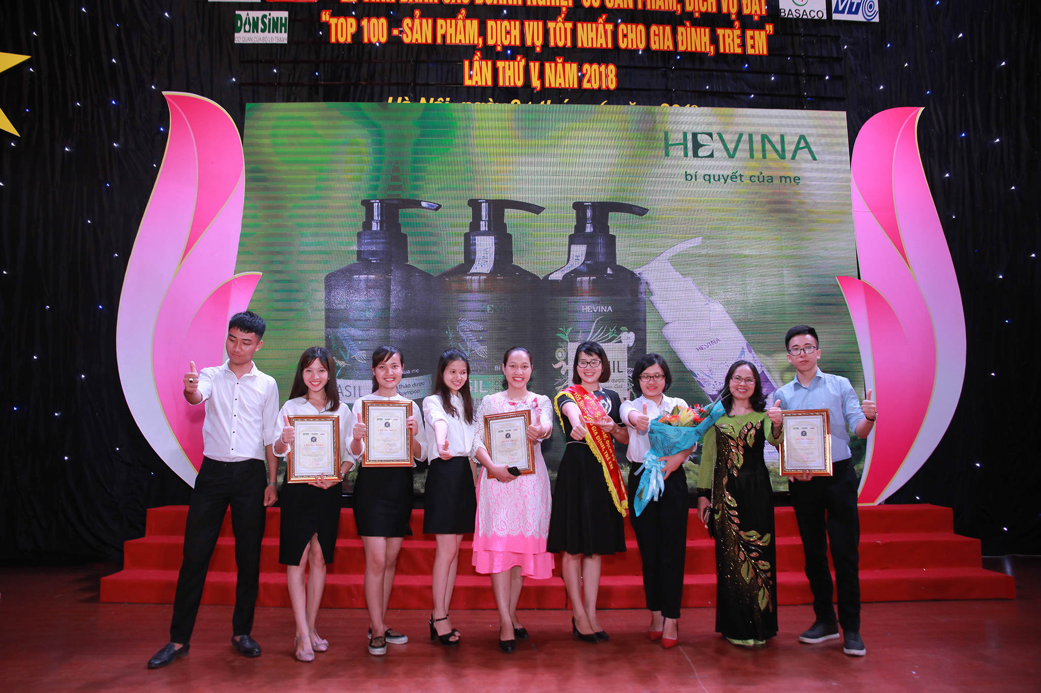 Tổng Giám đốc Đỗ Thị Nhàn và đội ngũ nhân viên Hevina trong Lễ trao giải các sản phẩm lọt Top 100 "Sản phẩm, dịch vụ tốt nhất cho Gia đình và Trẻ em" năm 2018 do người tiêu dùng bình chọn. Ảnh: Mạnh Toàn