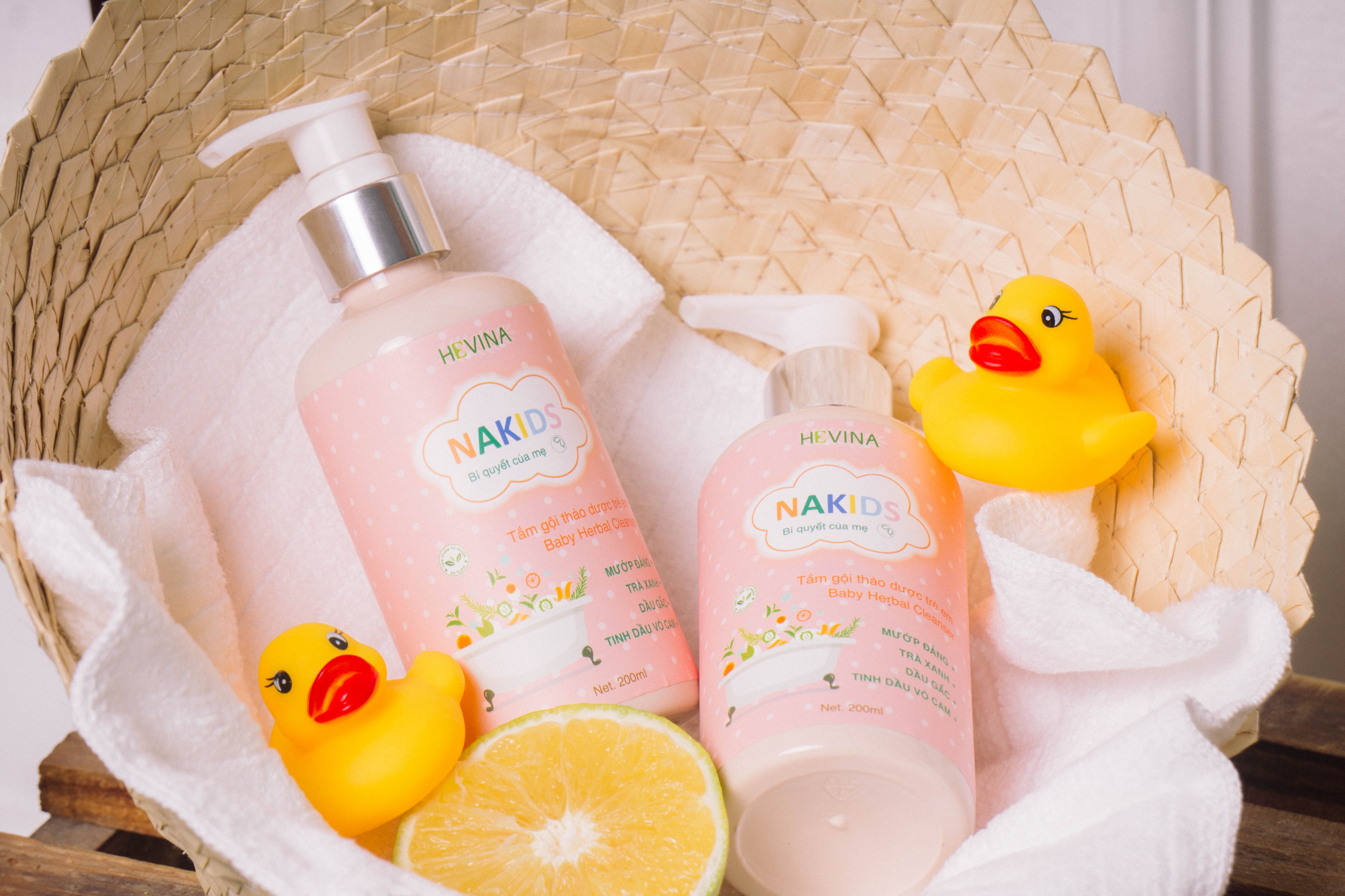 Tắm gội trẻ em NAKIDS chiết xuất từ Trà xanh, Mướp đắng, Dầu gấc, Vỏ cam hỗ trợ điều trị rôm sảy, mụn nhọt cho trẻ em rất hiệu quả.